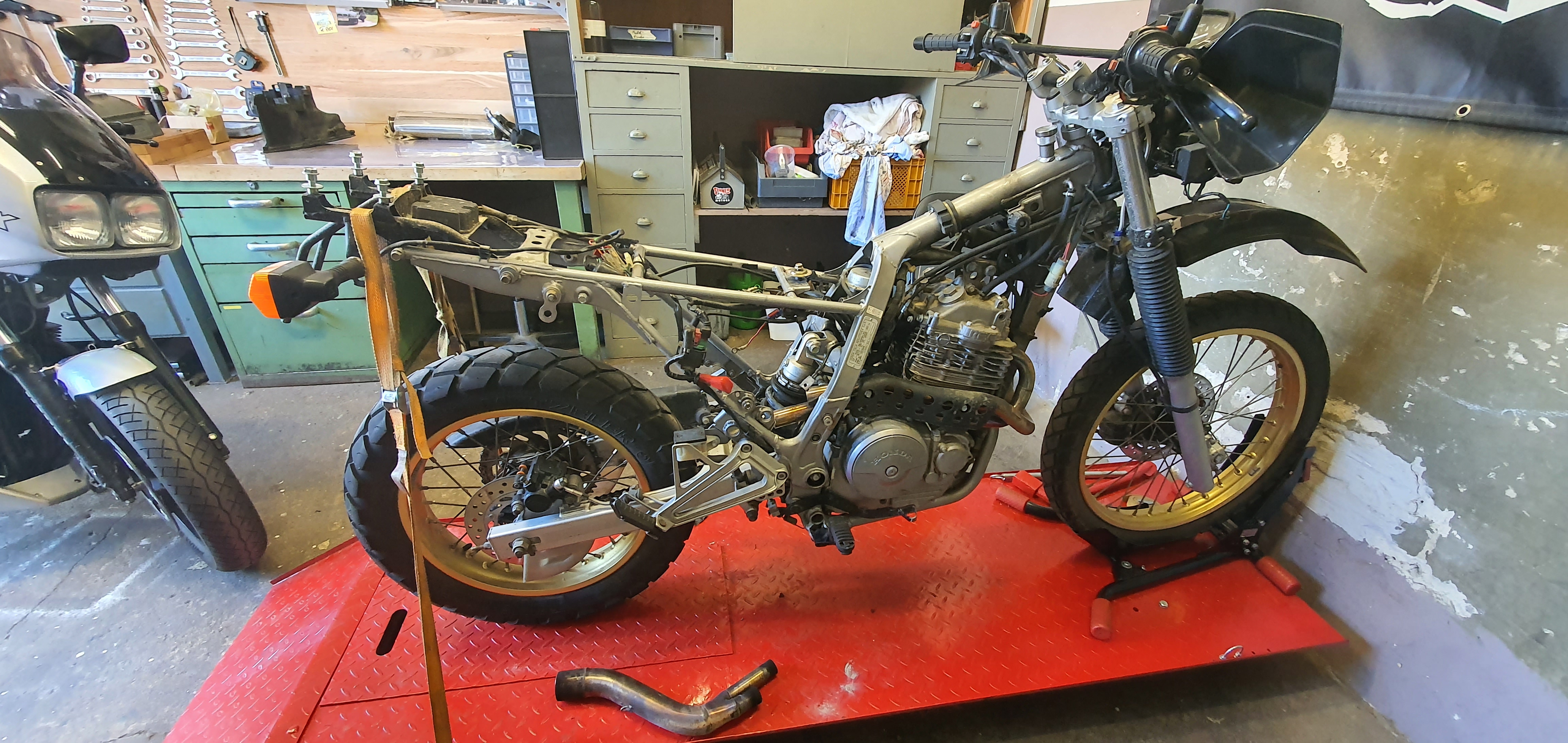 Gestern habe ich sie auf die Bühne genommen und sie weitestgehend nackt gemacht für eine Bestandsaufnahme. Sie hat laut Tacho 46t km gelaufen und Resultierend aus der Probefahrt stehen folgende Punkte bereits auf der To-do Liste: