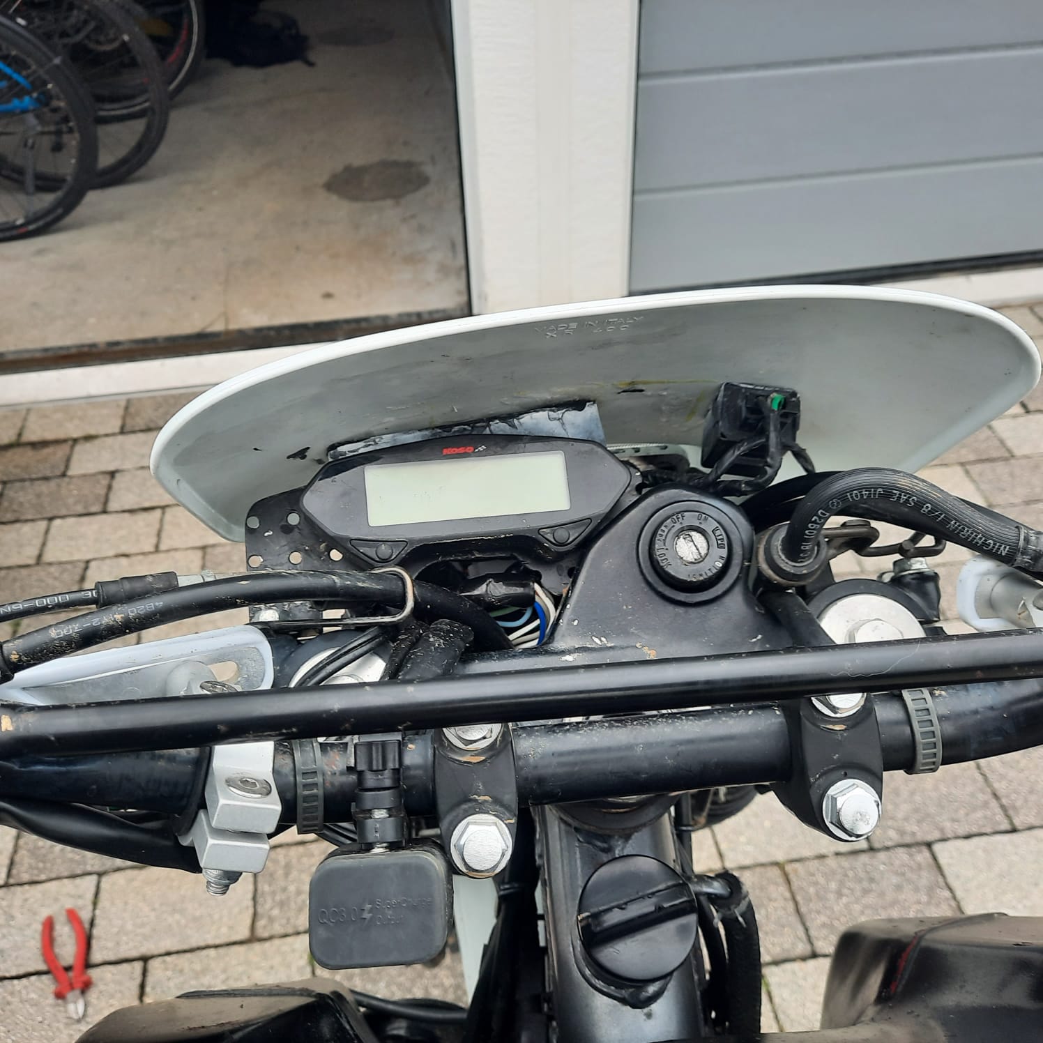 Um diese zu verbauen habe ich ausserdem auf einen KOSO DB01-RN Tacho gewechselt. Das war keine grosse Sache, nur Zündungsplus und Immer-Plus vom Zündschloss abzugreifen war etwas umständlich. Ausserdem musste ich einen neuen Halter für den Magnetsensor vom Tacho bauen, da die originalen von Koso zu kurz sind für die Domi. Entsprechend musste ich auch die vordere Bremsabdeckung etwas bearbeiten, was aber mit einem Heissluftföhn und einem alten Schraubenzieher auch kein Problem ist. Der Lack platzt dabei zwar ein bisschen auf, da das aber an der Unterseite der Gabel war, war es mir egal.