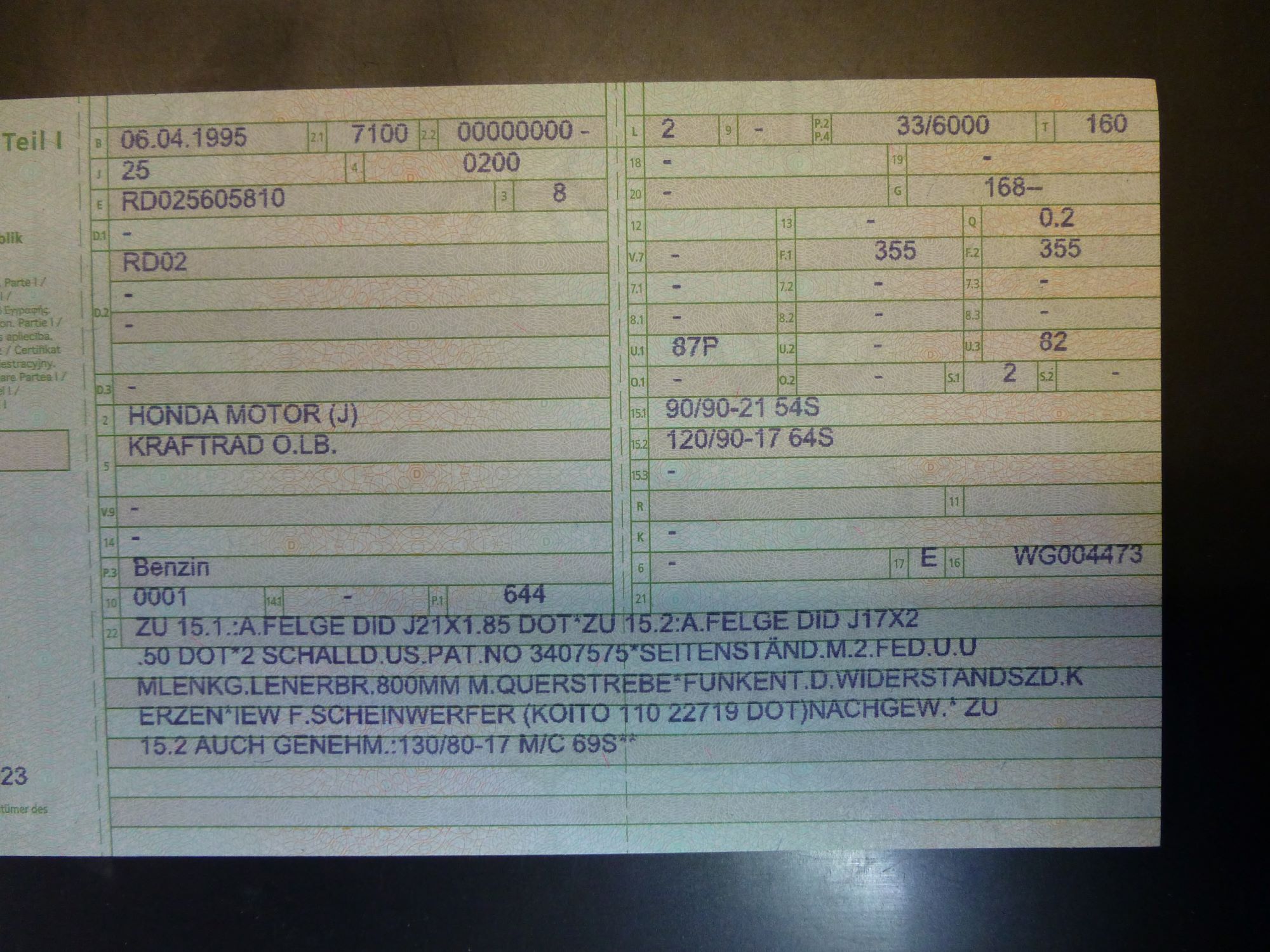 Sollten an irgendeiner Stelle bei TÜV, DEKRA, Flensburg oder sonstwo, auf die ich keinen Zugriff habe, für meine Domi dennoch Reifenbindungen hinterlegt sein, würde ich so argumentieren: Die Betriebserlaubnis meiner Domi ist per Einzelgenehmigung/Einzelabnahme (Buchstabe "E" in Feld 17 vom Fahrzeugschein/Brief) erteilt worden. Alle zu beachtenden Details stehen im Fahrzeugschein. Folglich gilt: Keine Reifenbindung im Fahrzeugschein eingetragen = keine Reifenbindung für dieses Motorrad vorhanden. Färdsch.