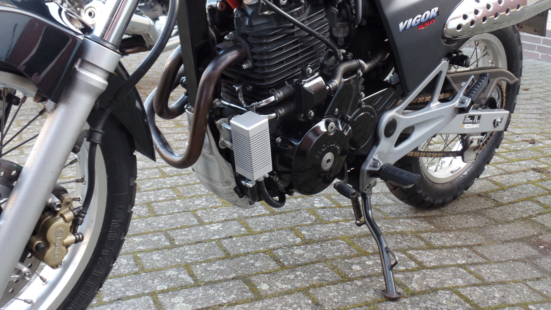im Dezember montierte ich an meiner Vigor 650 den ABP-Ölkühler. Der zeitliche Aufwand lag bei ca. 2,5-3 Stunden mit Ölwechsel. Das Ölvolumen habe ich wegen des Kühlers und der Leitungen um 50ccm erhöht. So wird ordentlich die max. Markierung erreicht. Die originalen Schrauben für die Befestigung habe ich nicht wieder verwendet, da diese von der anderen Seite durchgeschoben werden müssten. Hierfür müsste der Krümmer demontiert werden. Ich hab alternativ eine 8mm Gewindestange genutzt und die Muttern beidseitig mit Schraubensicherung versehen. Die originale Schlauchklemmungen wurden mit einem Dremel geöffnet. Dies ging gut. Die Verlegung der Schläuche unter dem Motor ist etwas fummelig, aber es geht.