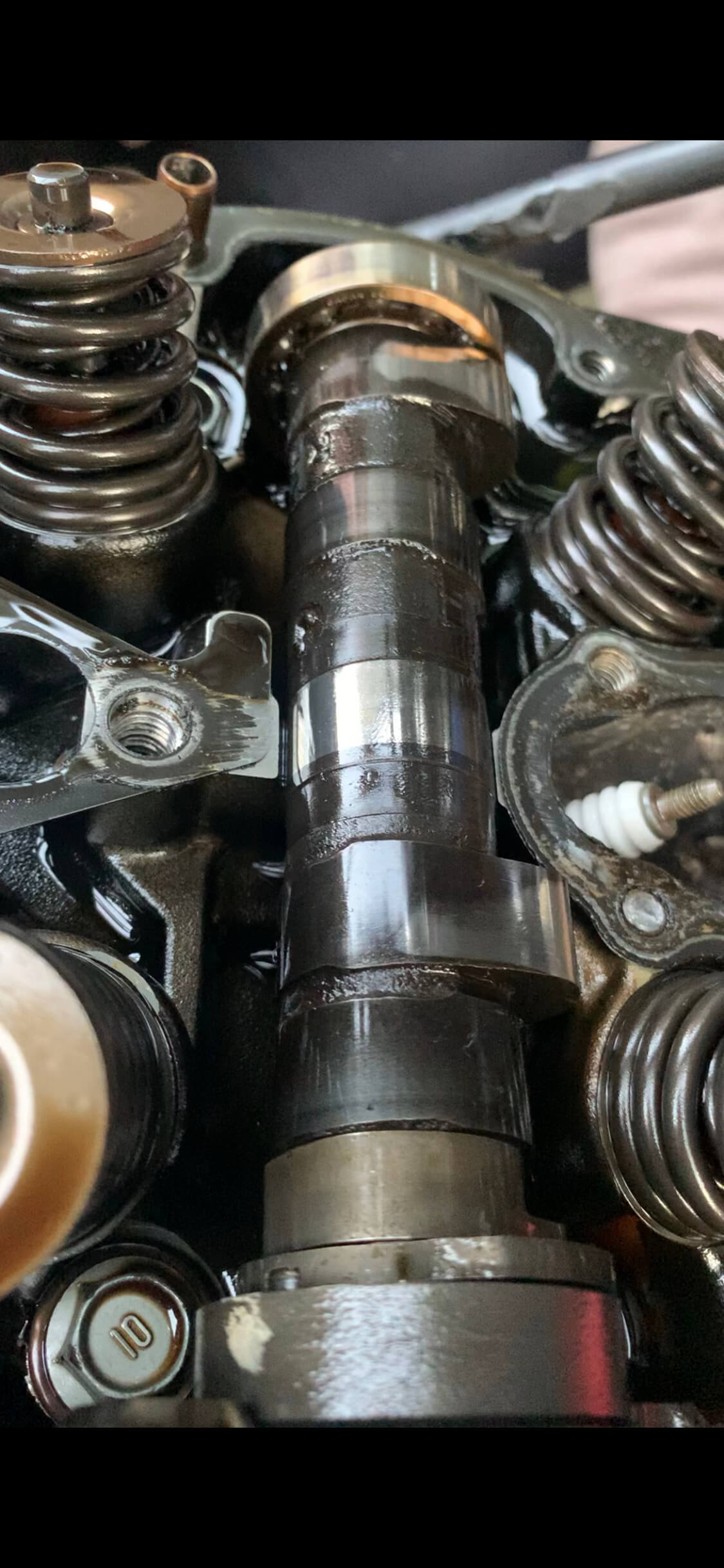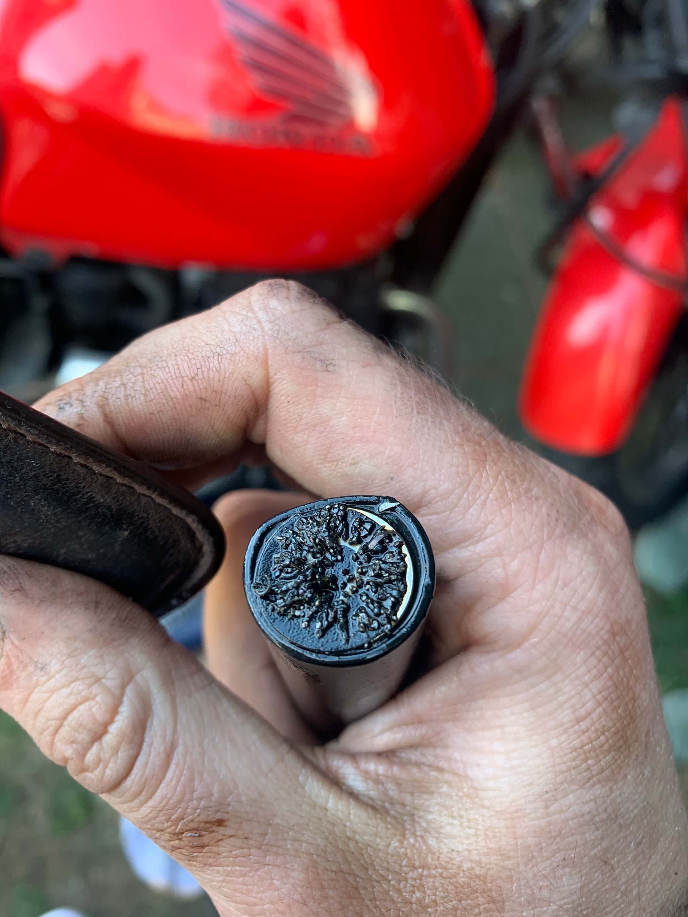 Einen Tag nach der Tour habe ich das Öl abgelassen. Das Öl aus dem Rahmen sah gut aus, unten am Motor fielen mir jedoch viele kleine Späne auf (siehe Foto). Ich habe mit einem Endoskop in den Zylinder geschaut, auch wenn es keine gute Qualität hat, erkenne ich für die Laufleistung keine schlimmen Abnutzungsspuren an den Wänden, auch nicht an den Nockenwellen. Das sieb unten an der Kurbelwelle war blitzeblank, keine späne, kein Dreck oder ähnliches, auch das sieb oben am rahmen. Die Späne sind magnetisch, könnte es von der Kurbelwelle sein?