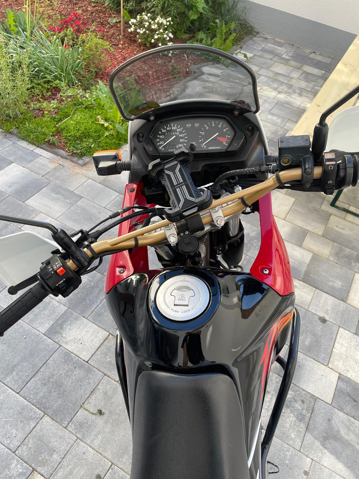 Soweit ist alles Werk, außer das Windschild, der Motorsturzbügel und die Taschenhalter. Außerdem hat der Vorbesitzer eine USB-Buchse verbaut, die werde ich aber wieder abnehmen, da sie direkt an die Batterie führt, lediglich mit einem Relais dazwischen. Die Verkleidung für die Bremsanlage ist wohl schon lange weg, ich hätte sie aber vermutlich auch nicht drangelassen. Die Handyhalterung ist von mir, zwecks Navi.