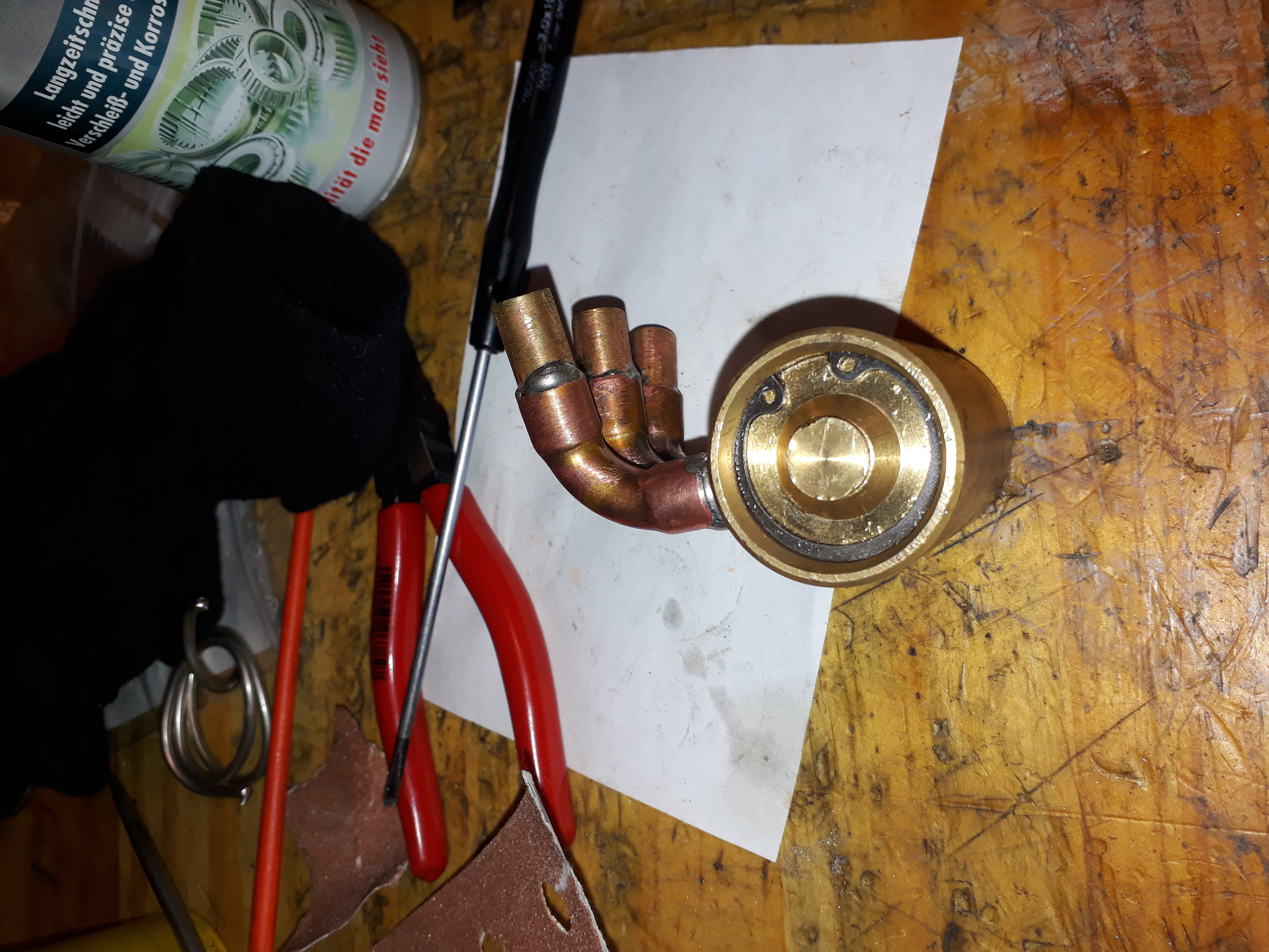 Durch Verschachtelung von Feder und Schieber, sowie Umgestaltung des Gehäuses habe ich das Thermostat quasi nochmal erfunden. Die Fertigung ist deutlich einfacher geworden. Dicht, und Schiebeflächen sind nun in einem Schritt herstellbar. Keine Planen Dichtflächen mehr. Geschraubt wird auch nix. Aber ich lasse Bilder sprechen:
