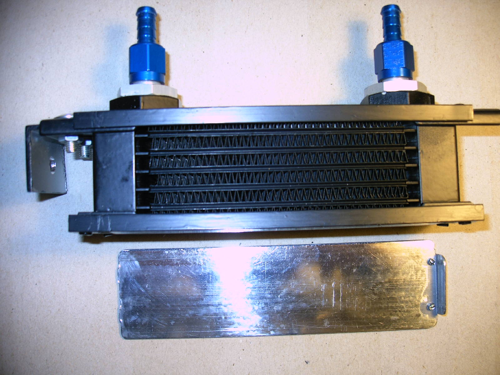 Die nach unten gerichteten Anschlüsse des Jagg-Kühlers für die Ölleitungen haben den Vorteil, dass man einen Thermostaten zwischen Alublech und Motorgehäuse unterbringen und bequem über Ölschläuche mit dem Kühler verbinden kann.